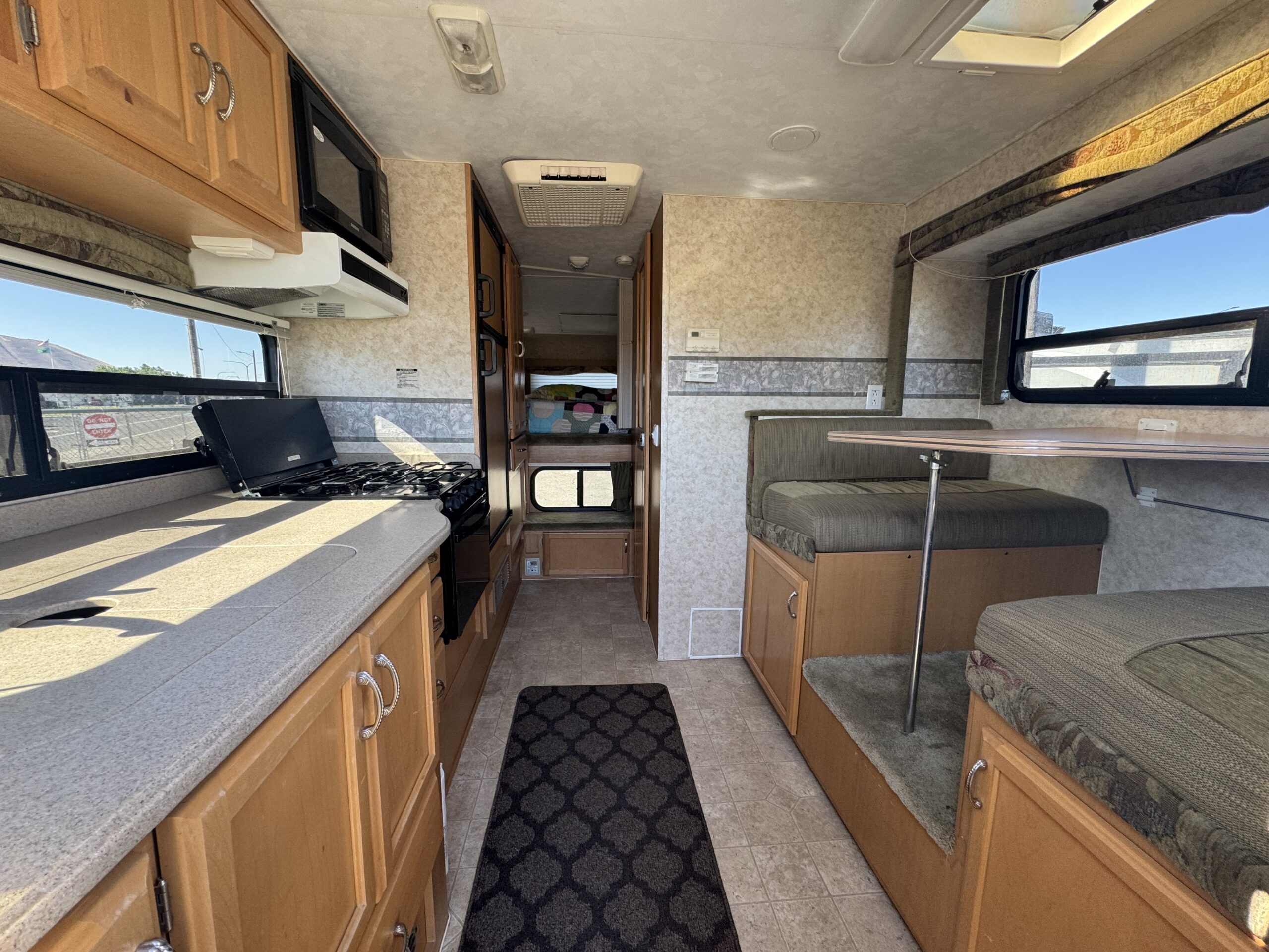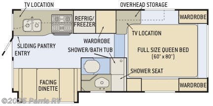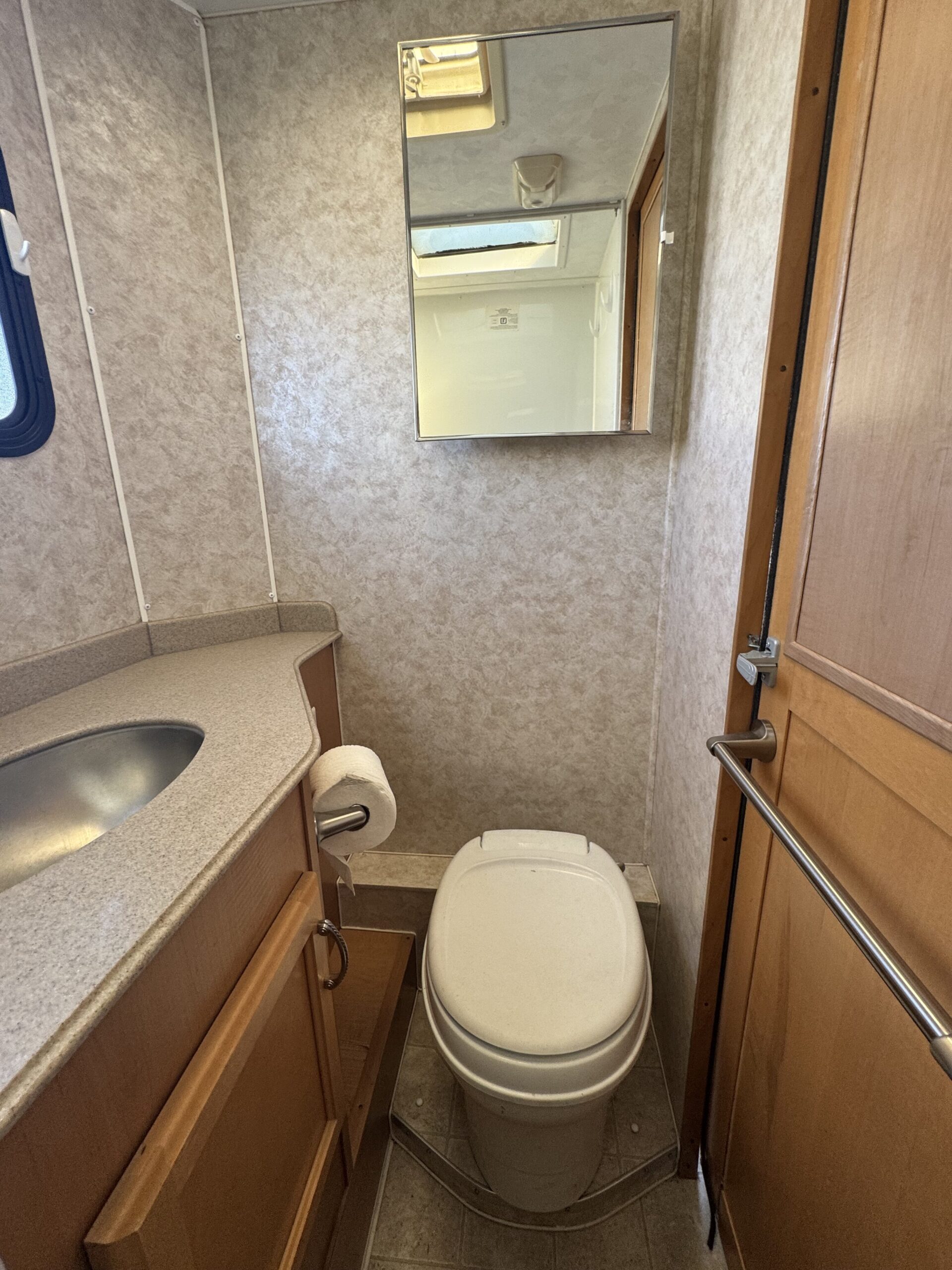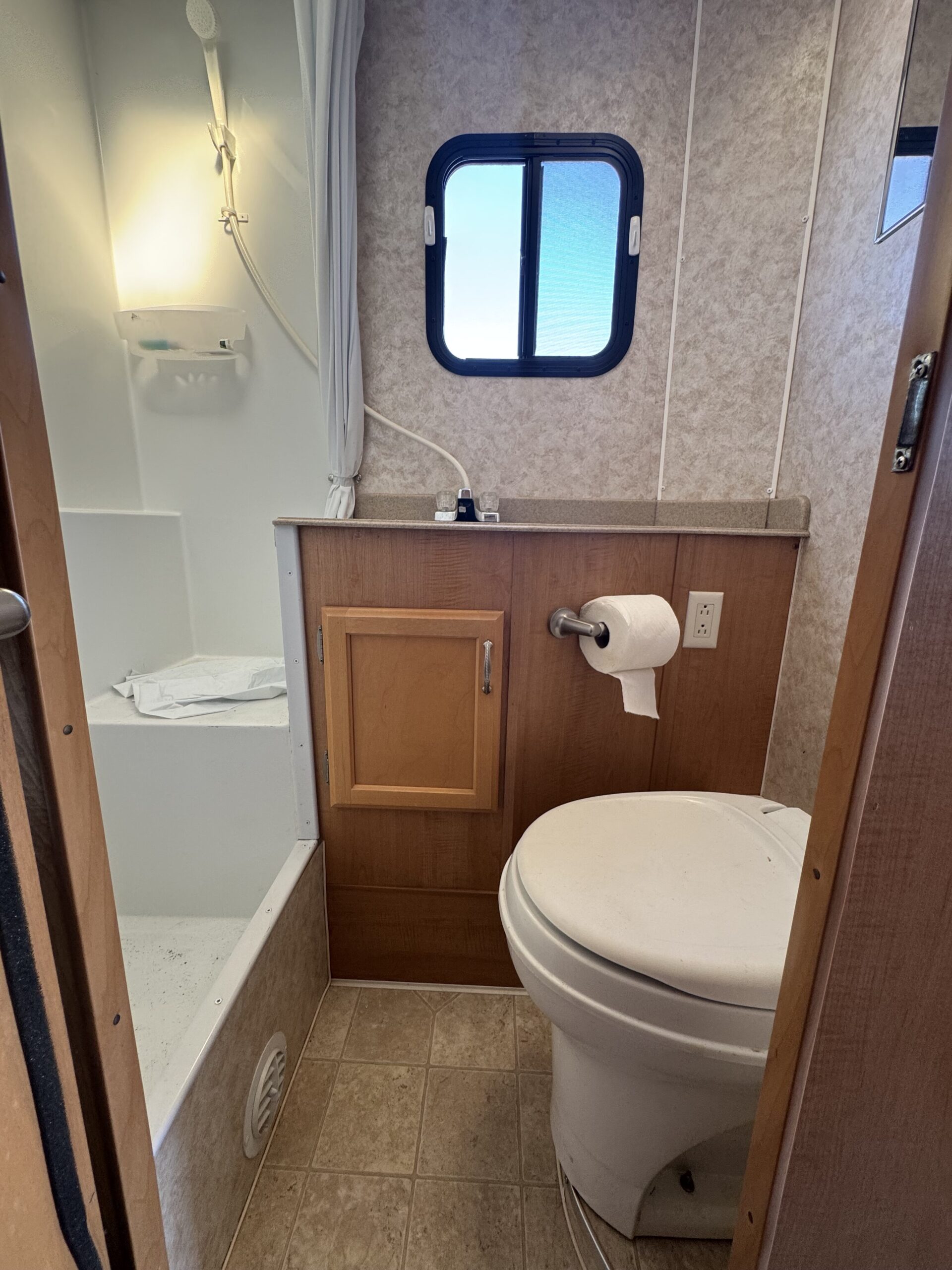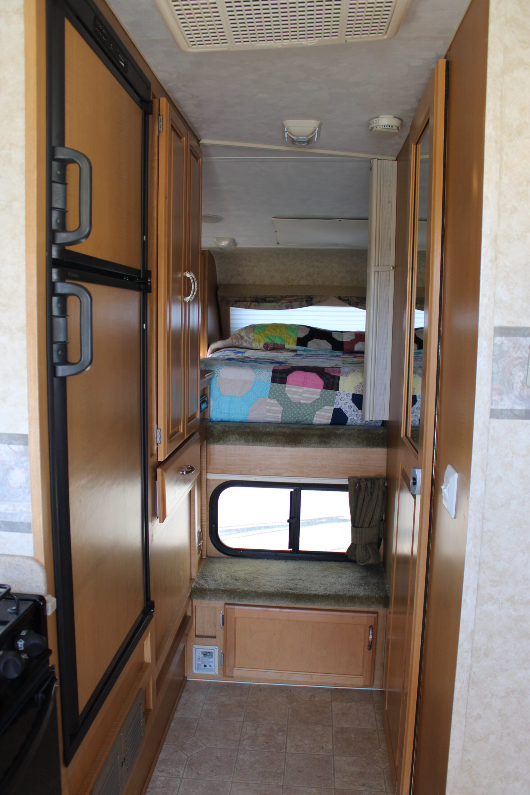 - Bedroom: Queen bed with storage, opposing windows for airflow, and often a TV setup.