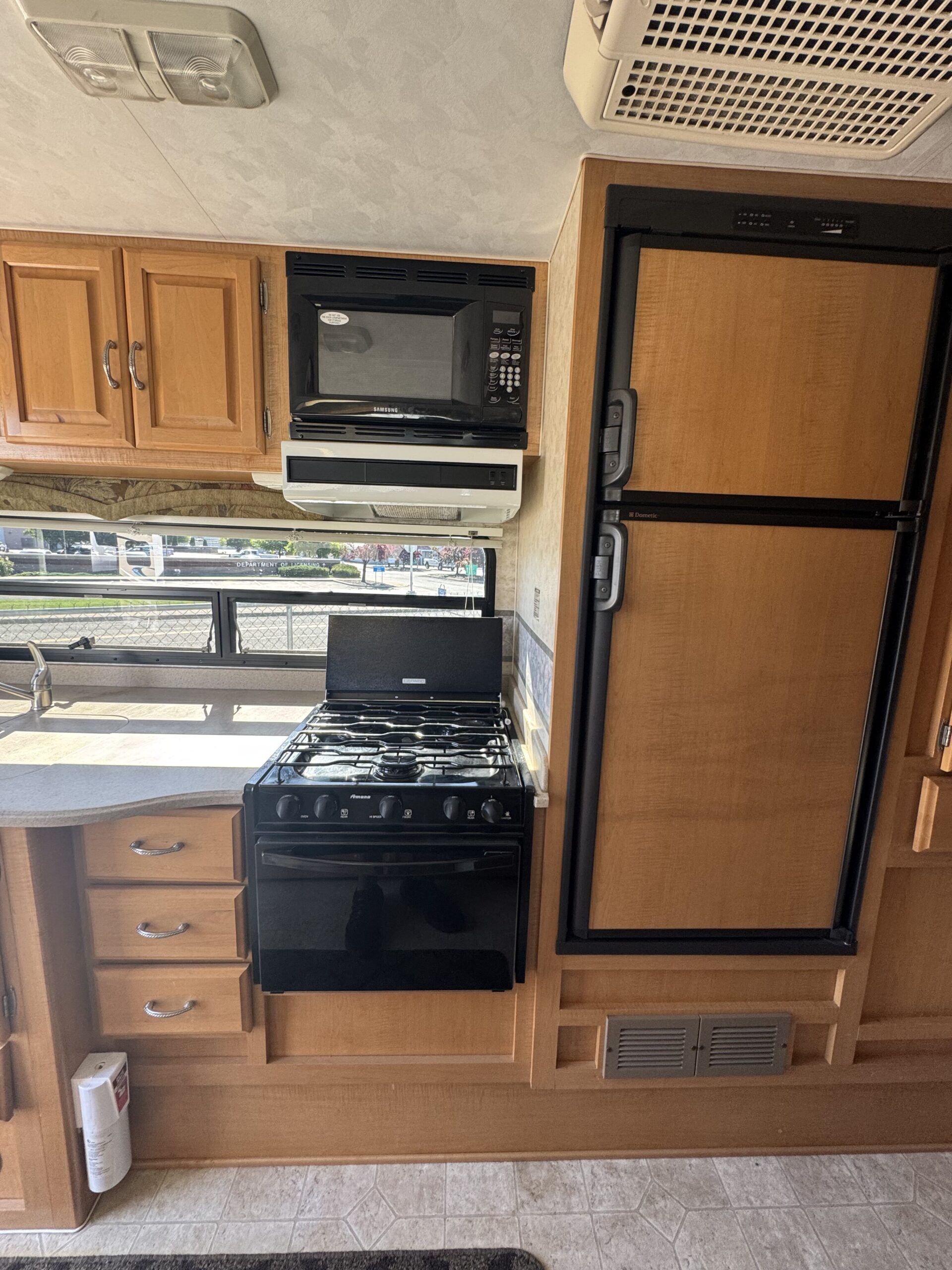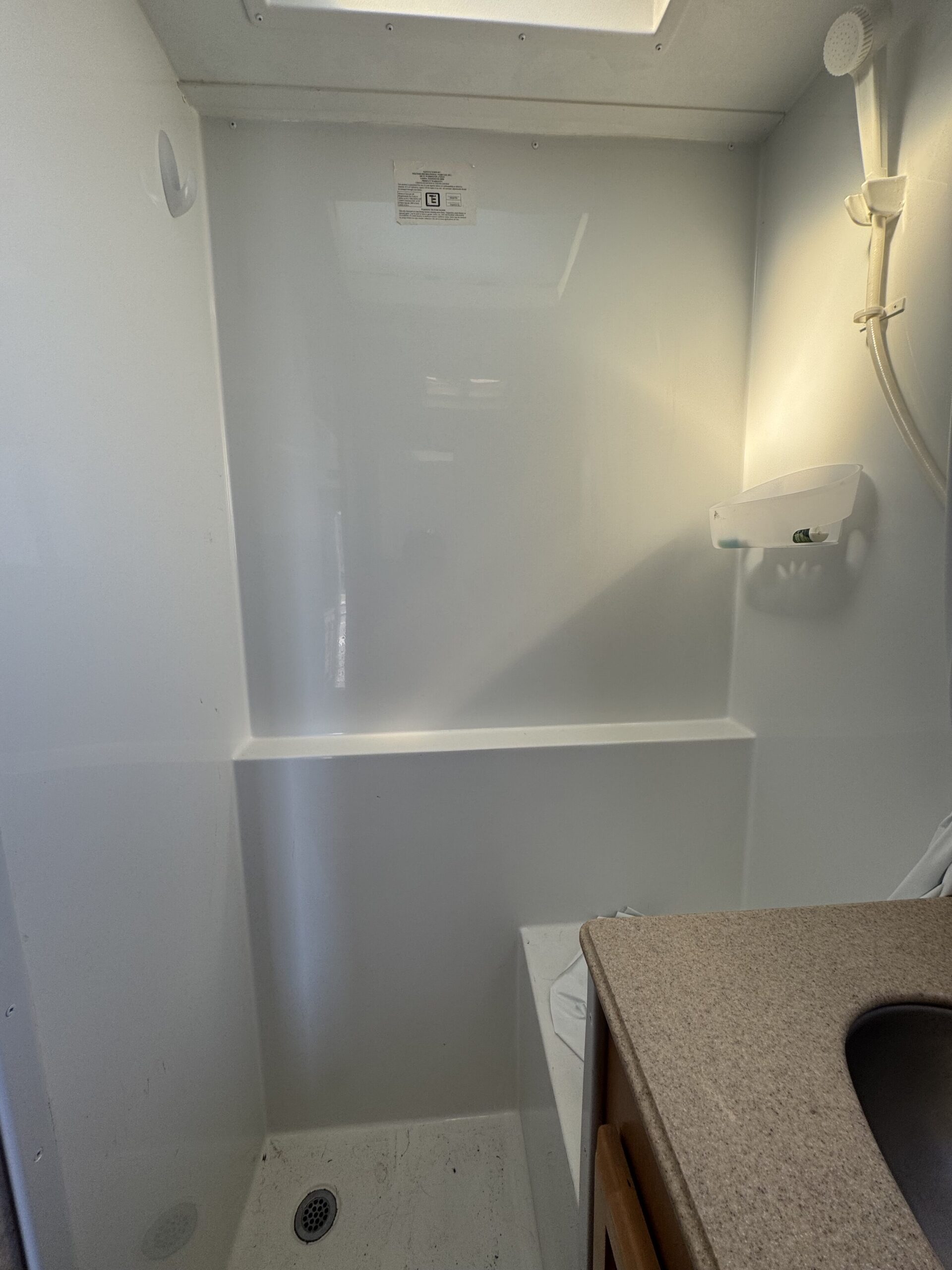 - Construction: Fiberglass siding, solid surface counters, and a walkable roof with a ladder.