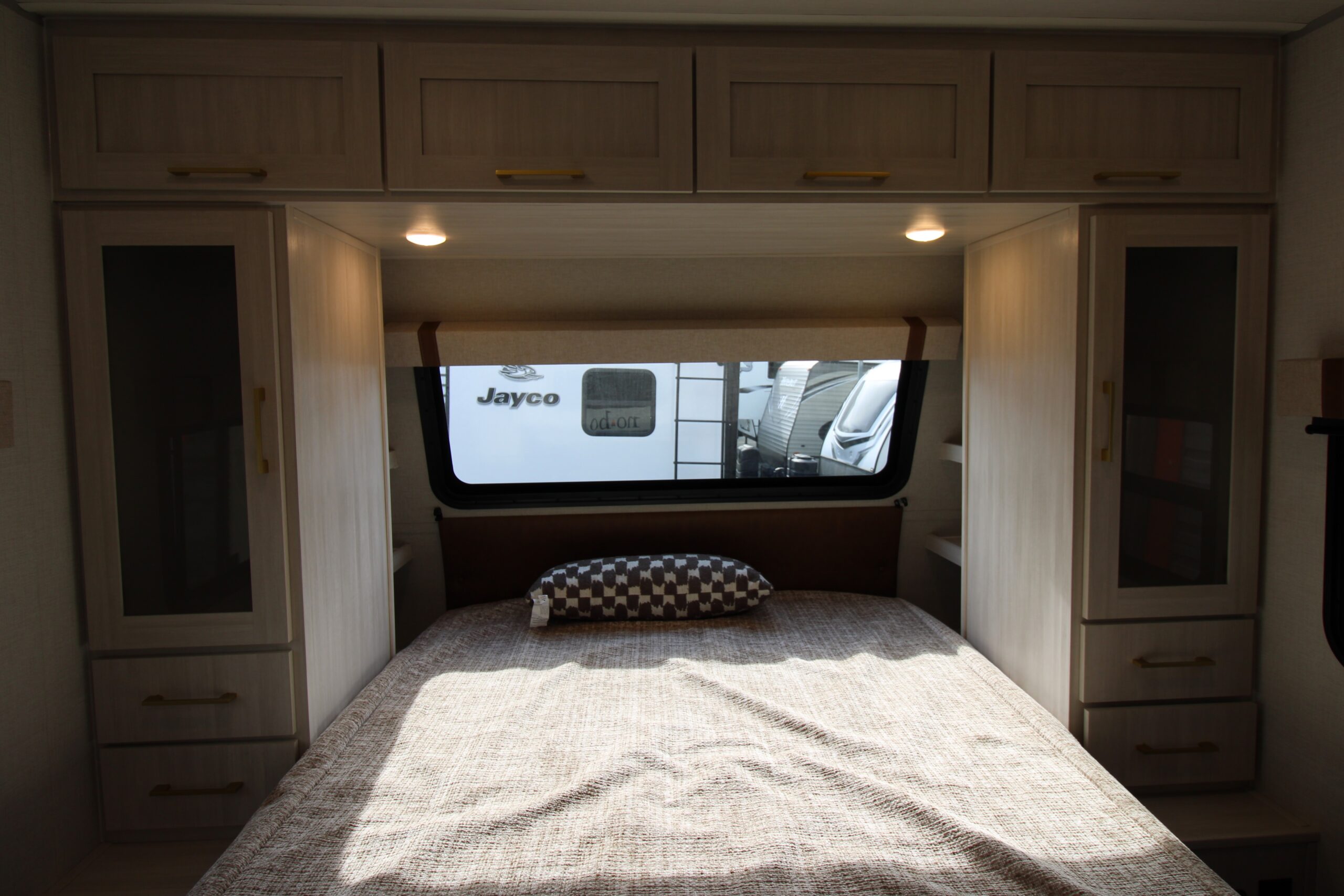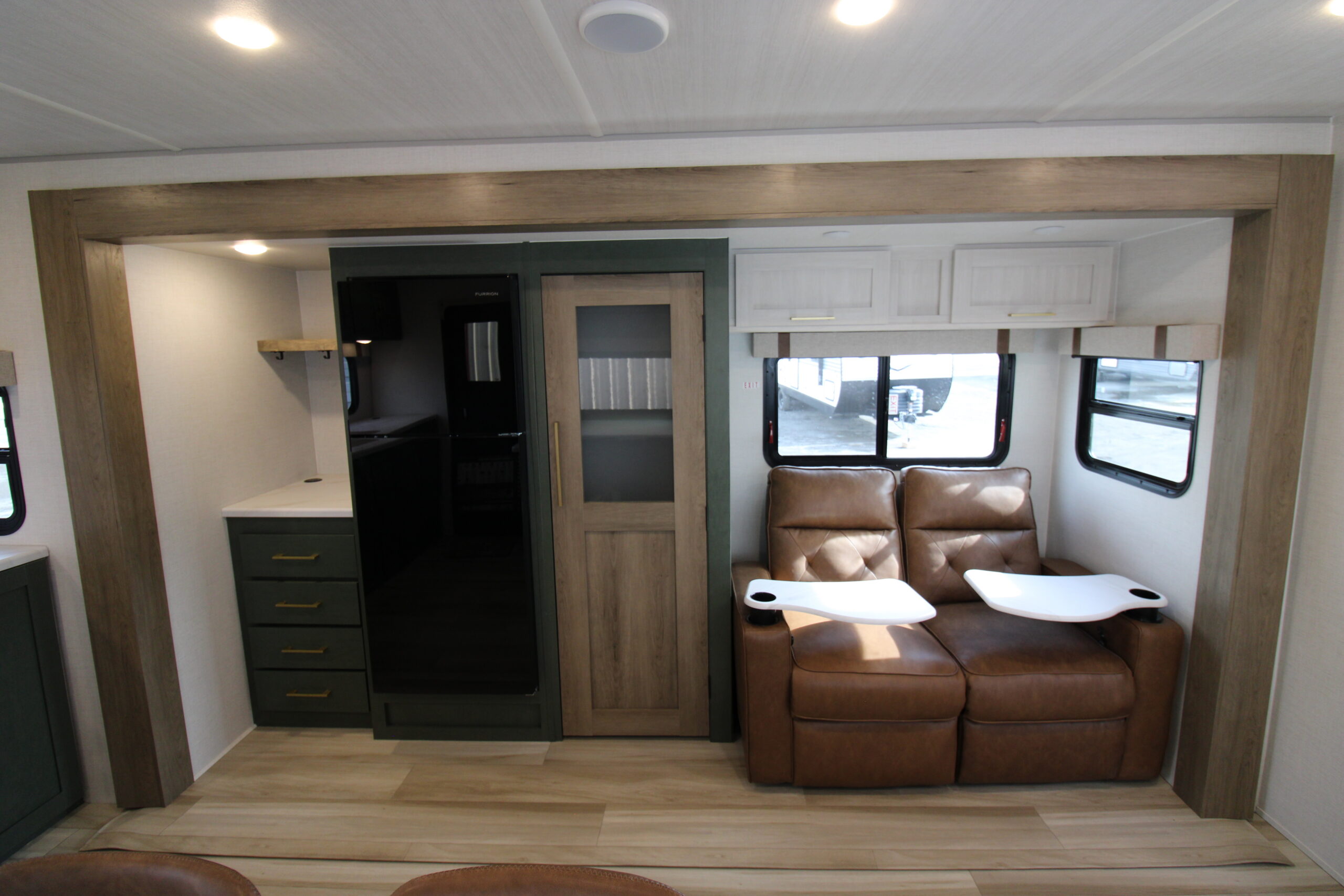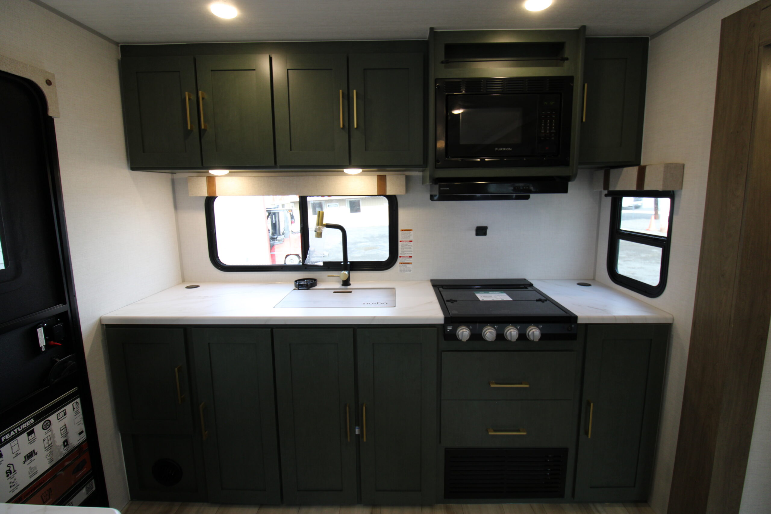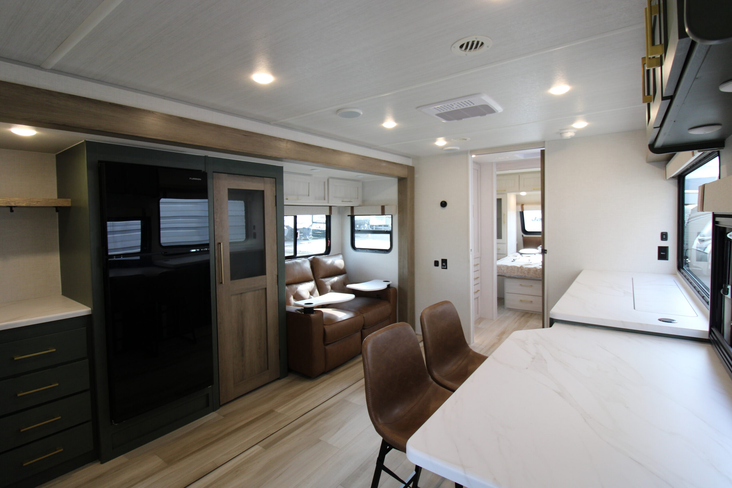 Compact and adventure-ready, this travel trailer features a queen Murphy bed, slide-out dinette, L-shaped kitchen with bar seating, and rear full bath. Built for extended-season use with a 16′ power awning, on-demand tankless water heater, and 15,000 BTU A/C, it combines comfort, convenience, and rugged versatility for the ultimate adventure.