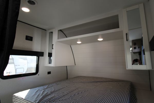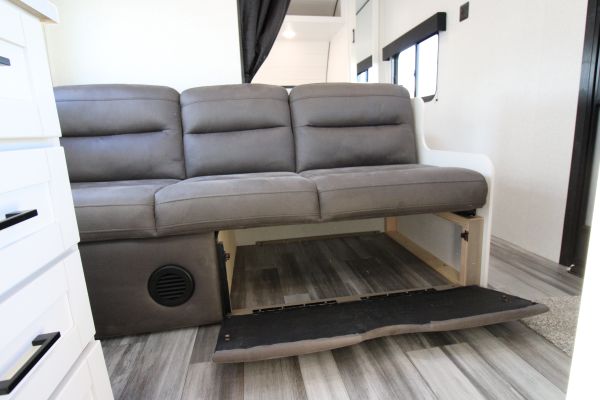 Inside, you’ll find solid hardwood cabinet doors with hidden hinges, giving the space a modern, residential feel. Oversized cabinets and under-bed storage ensure there’s room for everything you need, while the lit exterior passthrough storage makes packing and unpacking a breeze.